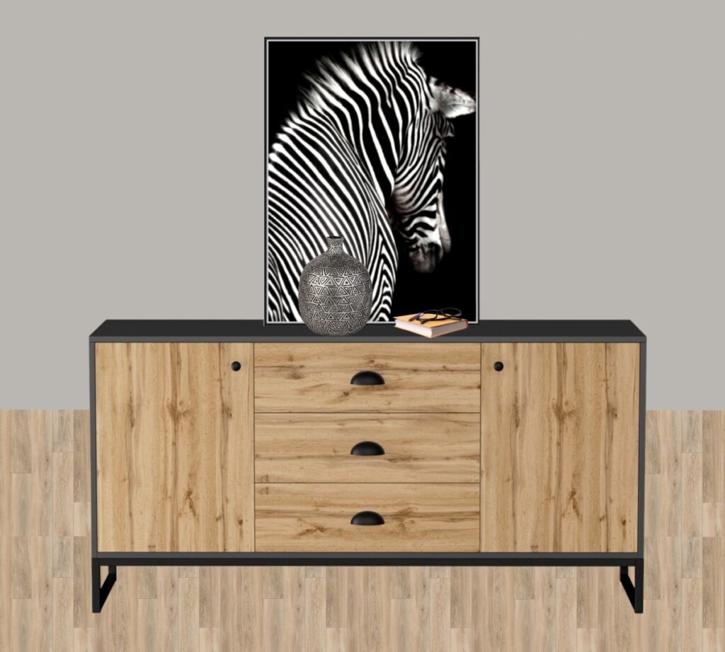 На комоде Лофт размещена крупная картина, которая привлекает больше всего внимания — это центр композиции. Около нее располагаются другие предметы: ниже по высоте и не такие заметные.