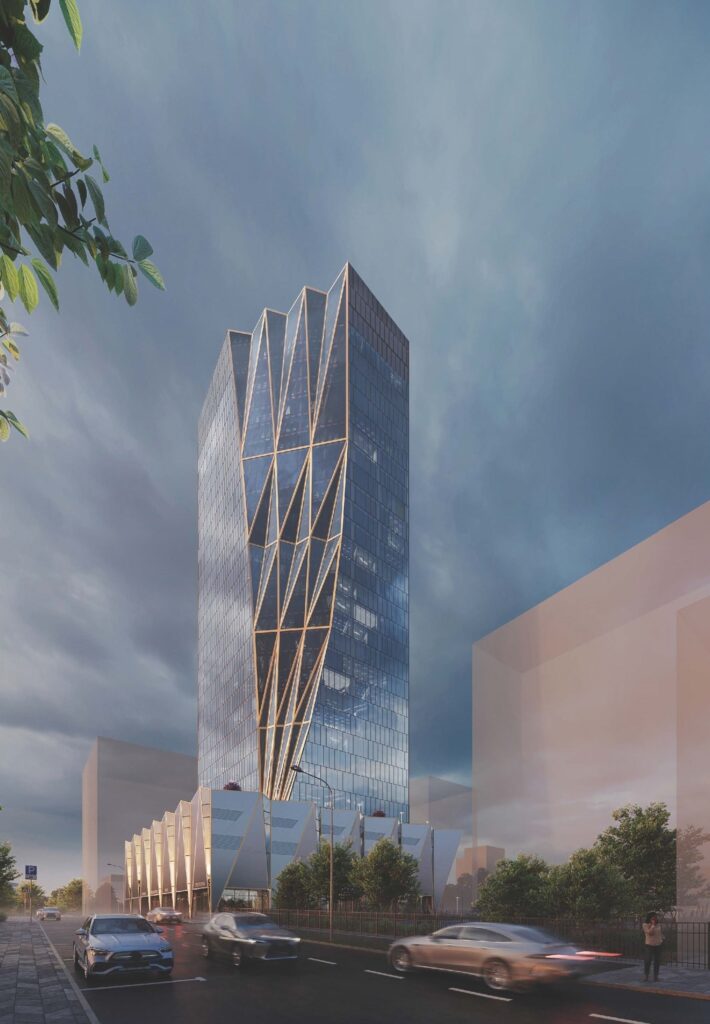 ▪️Здание площадью 48,2 тыс. кв. м получит футуристичный облик за счет использования стекла и алюминиевых кассет темно-серого и латунного цветов.