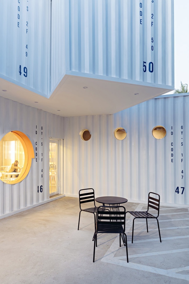 Сами контейнеры применены частично, однако единый «контейнерный» стиль распространяется на все интерьеры и экстерьер объекта, выделяя оранжевый и синий и белый цвета.