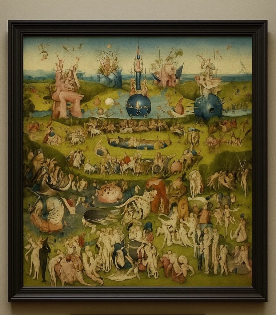 Иероним Босх пишет это не как кошмар. Здесь нет паники — только бесконечная плотность. Всё кажется почти веселым, даже игривым, но от этого ещё более неуловимым. Это не оргия и не аллегория, а как будто некий климат — температура мира, где всё живое перестаёт быть отделённым.