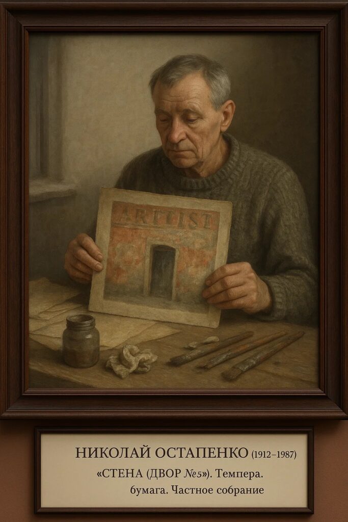 Имя Николая Остапенко почти нигде не упоминается — разве что в старом каталоге Дома художника в Николаеве и в одной неразобранной коробке из архивов местного музея. Родился в 1912 году, пережил две эвакуации, три переезда, один развод. Почти не выставлялся. Всё, что он делал — писал стены. Не как фон, не как архитектуру, а как главных героев: облезлые дворы, фасады с выбитыми буквами, штукатурку, которую давно не красили.