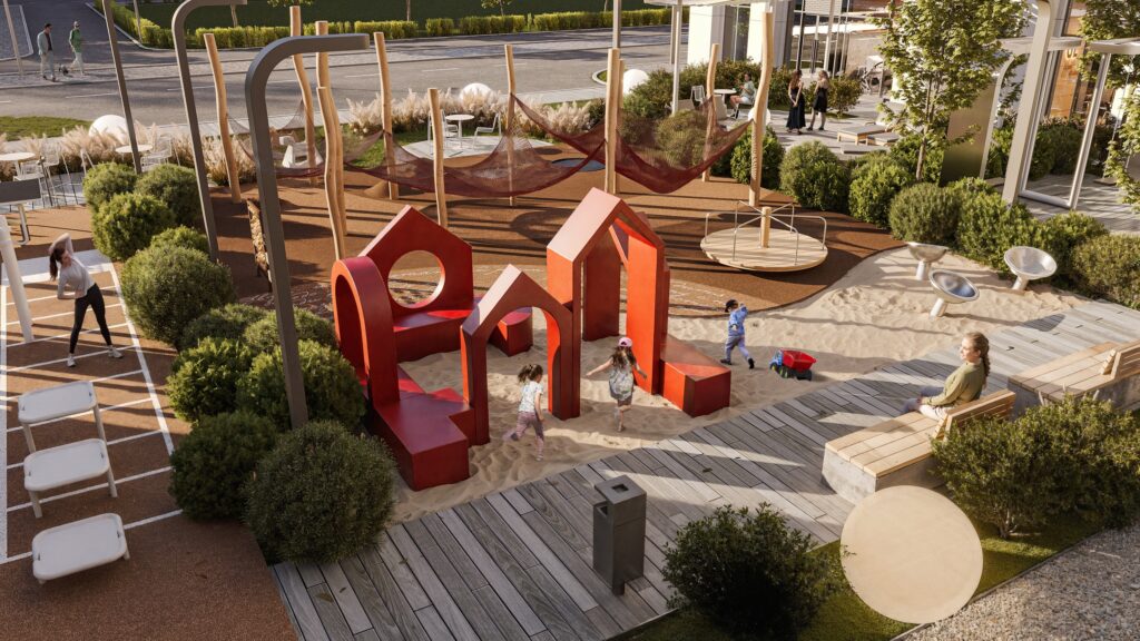 - Мультифункциональность — компактная детская площадка развивает навыки и воображение; спортивная зона объединяет воркаут‑комплекс и теннисный стол.