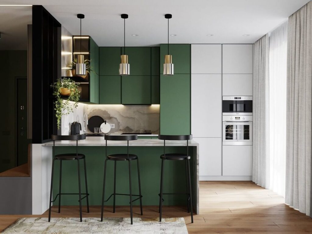 Проект недели: трешка с зеленой кухней и биокамином, 92 м²