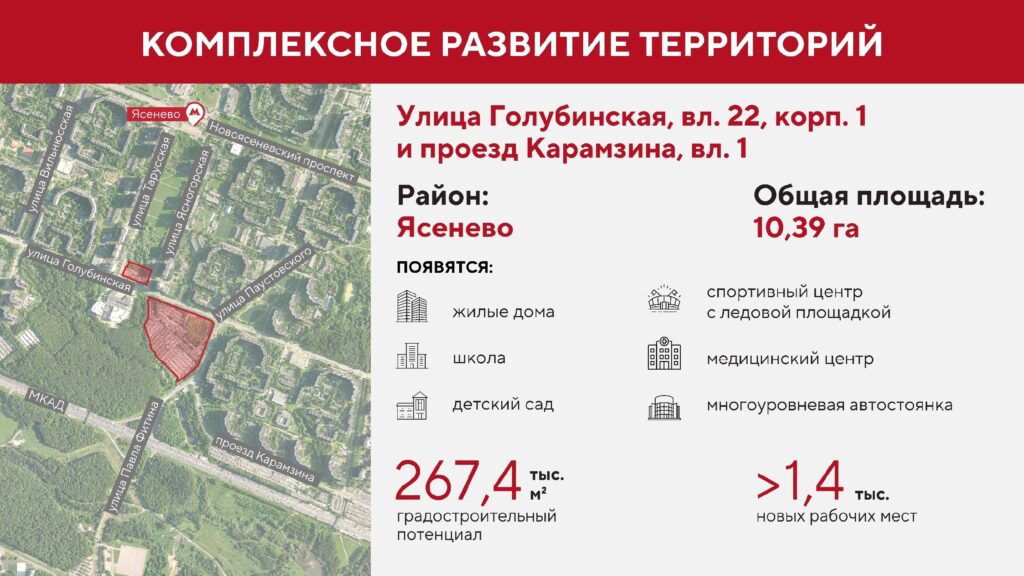 ▫️ В районе Ясенево возведём жилые дома, спортивный центр с ледовой площадкой, медицинский центр, многоуровневую автостоянку, в планах также школа, детский сад и другие общественно-деловые и социальные объекты.