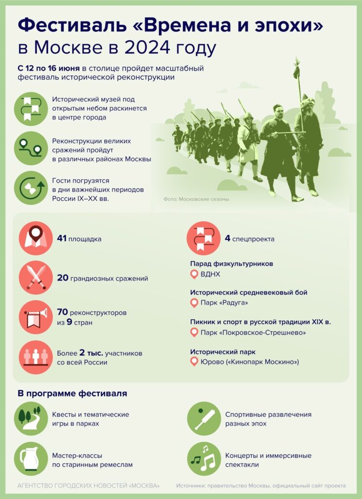 Фестиваль «Времена и эпохи» в Москве в 2024 году пройдет на 41 площадке с 12 по 16 июня. ADcity 2 года назад Подробности на инфографике от «Агентства городских новостей Москва».