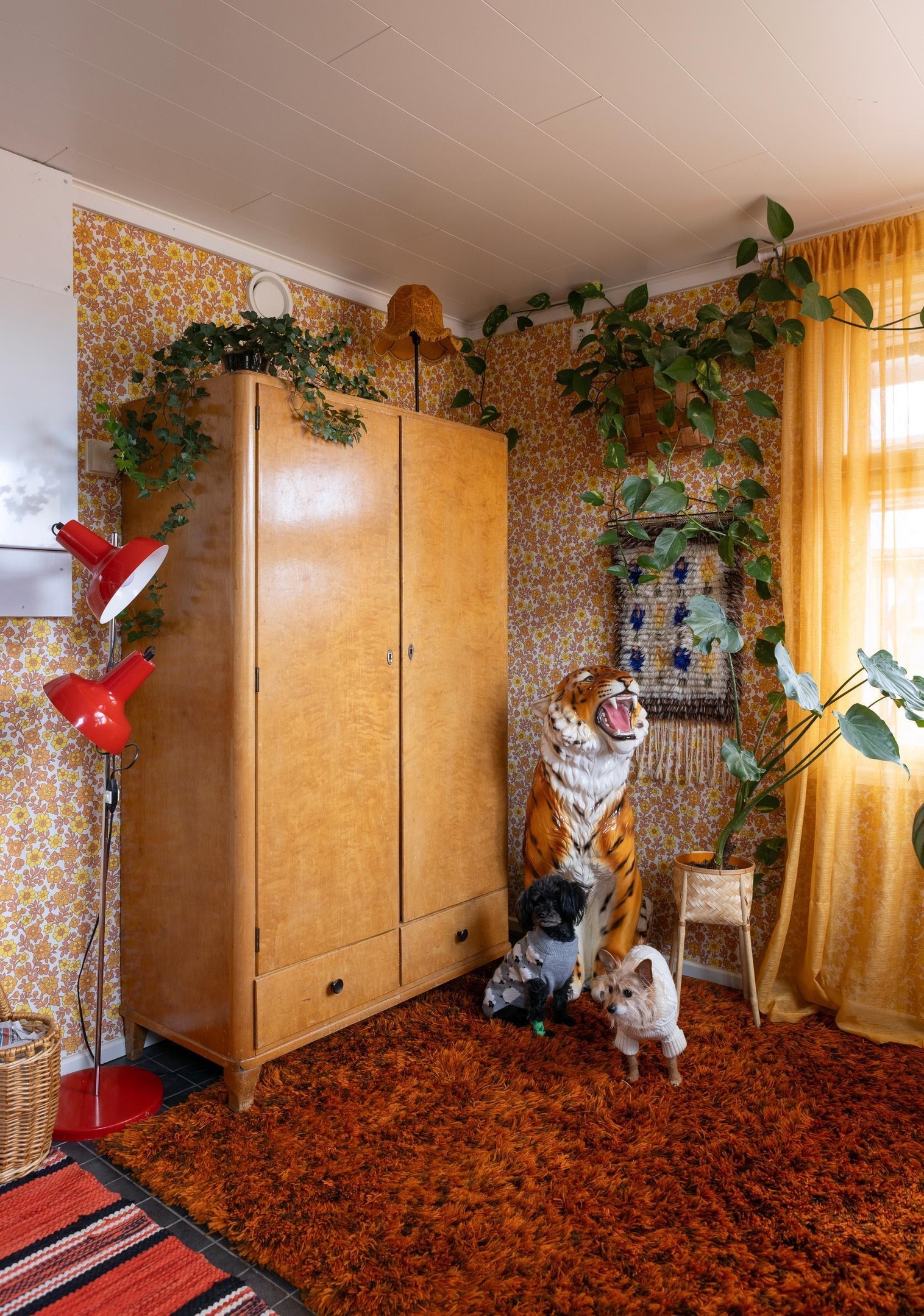 ГлавнаяАрхитектура 43Часть 1 Часть 1 23 января 2026 Нравится: 1 Часть 1 В доме Иины и Ииро в Финляндии всего в избытке: две кошки и собака, гигантский фарфоровый тигр Мика и множество других статуэток животных, стопки красочных лоскутных одеял и восемь разных видов обоев.