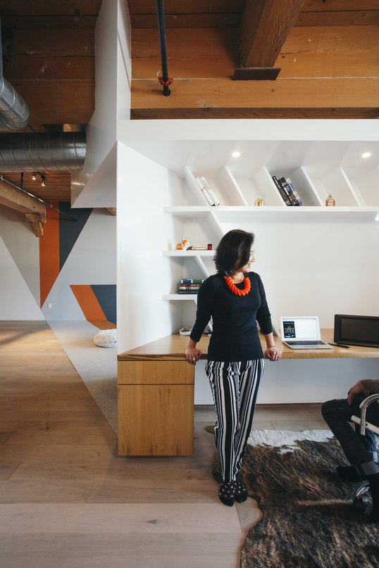 Центральным элементом лофта является модуль, функционирующий одновременно и как средство пространственного разделения и как блок мебели: письменный стол с одной стороны, полка и место для сидения — с другой.