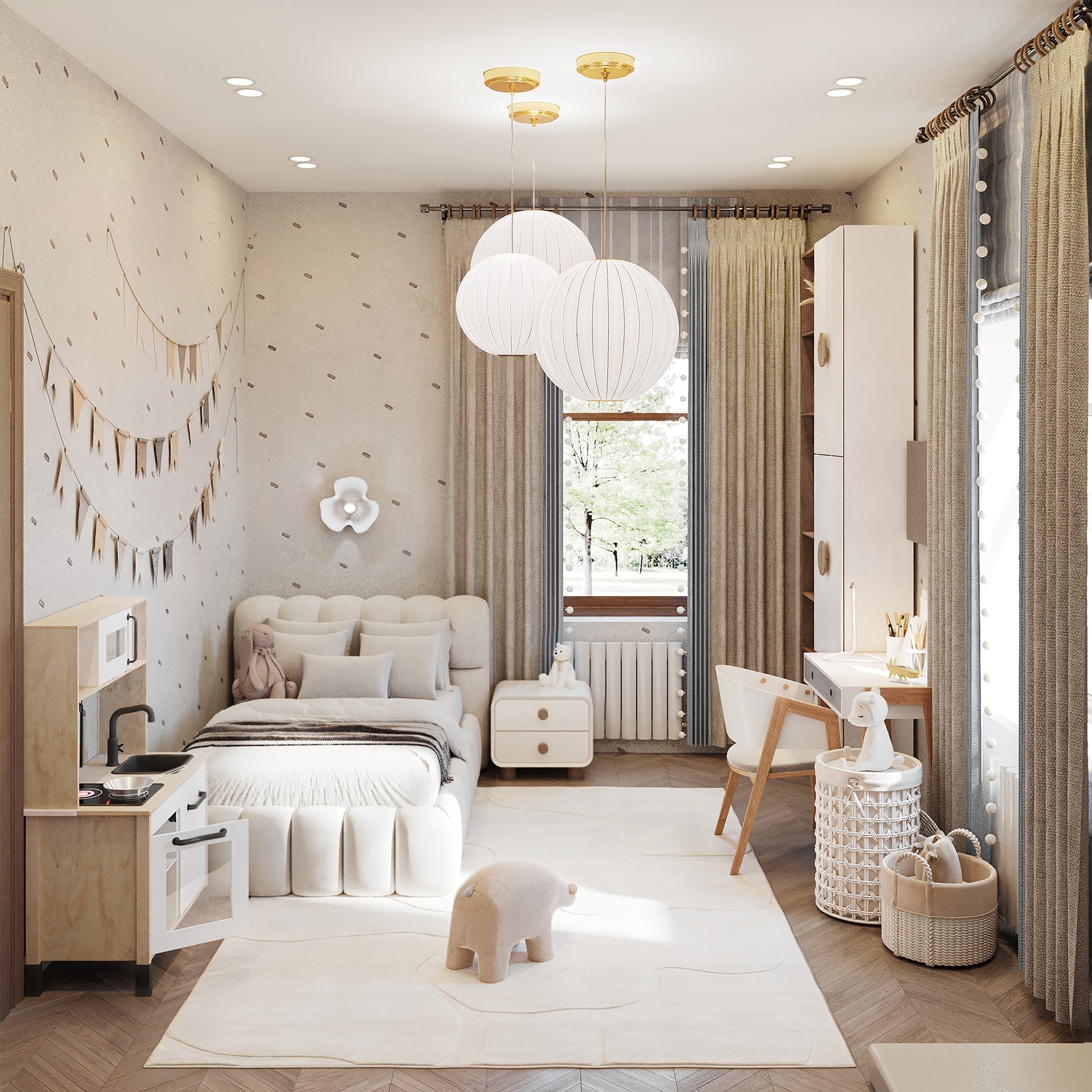 Решение: На визуализациях представлены идеи по трансформации пространства. Светлые цветовые решения украсят комнату, создавая атмосферу легкости и комфорта. Светильники Nelson Bubble обеспечат мягкое и равномерное освещение.