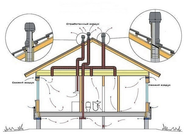 В деревянных или каркасных домах, блок каналов вентиляции собирают из пластиковых или стальных оцинкованных труб. Блок из труб закрывают коробом.