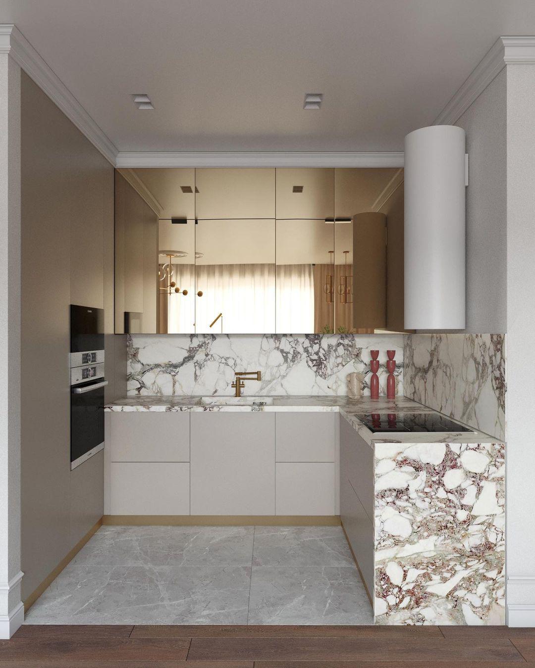 Центром притяжения стала эффектная кухня с золотыми зеркальными фасадами, которые мягко отражают свет и визуально расширяют пространство. Натуральный камень в отделке фартука и столешницы добавляет интерьеру глубины и благородной фактуры, создавая гармоничный контраст с лаконичными современными линиями мебели.