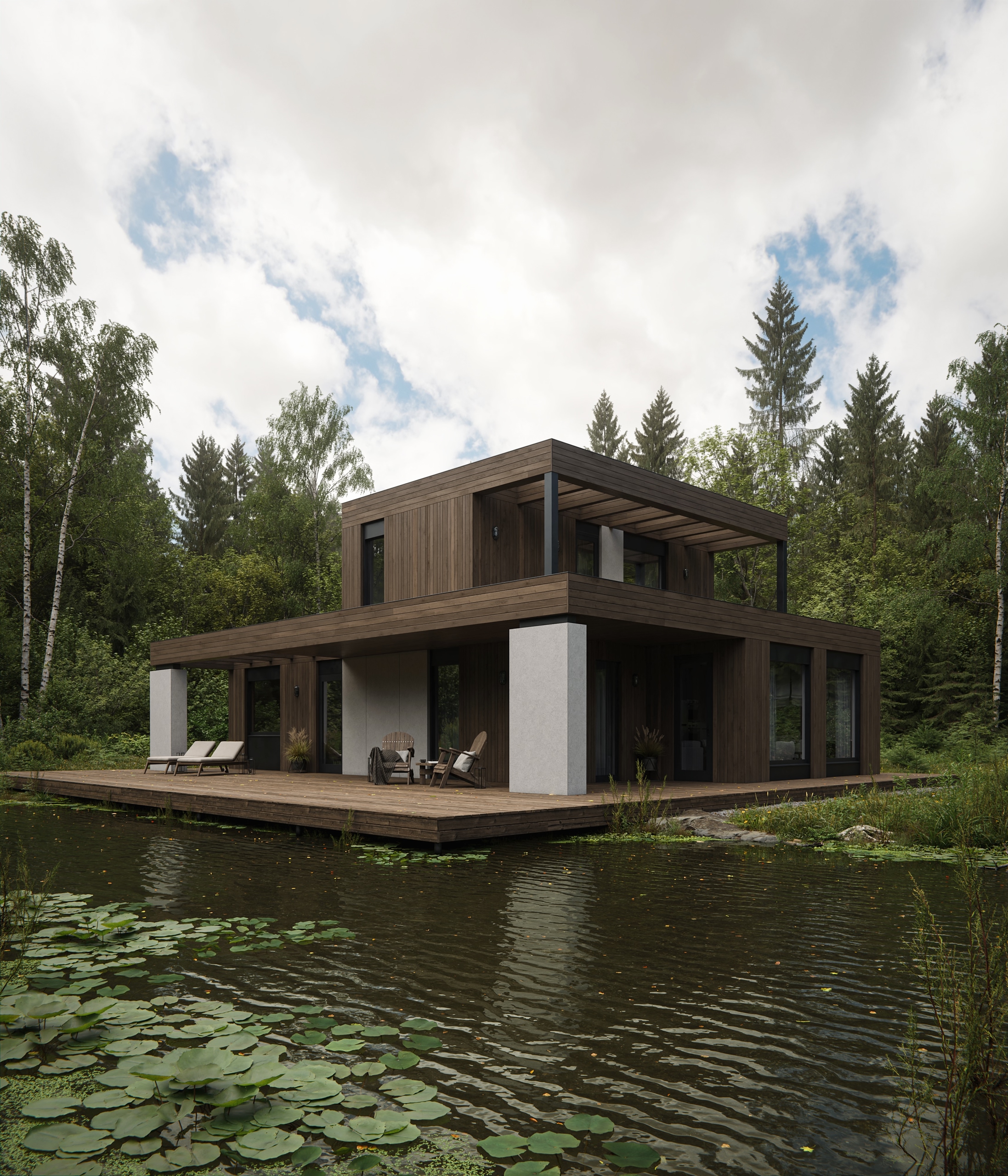 Визуализация гостевого дома с террасой-пирсом у реки. Вдохновением для данной работы послужили фотографии простых, около лесных речушек из моего родного Пермского края.