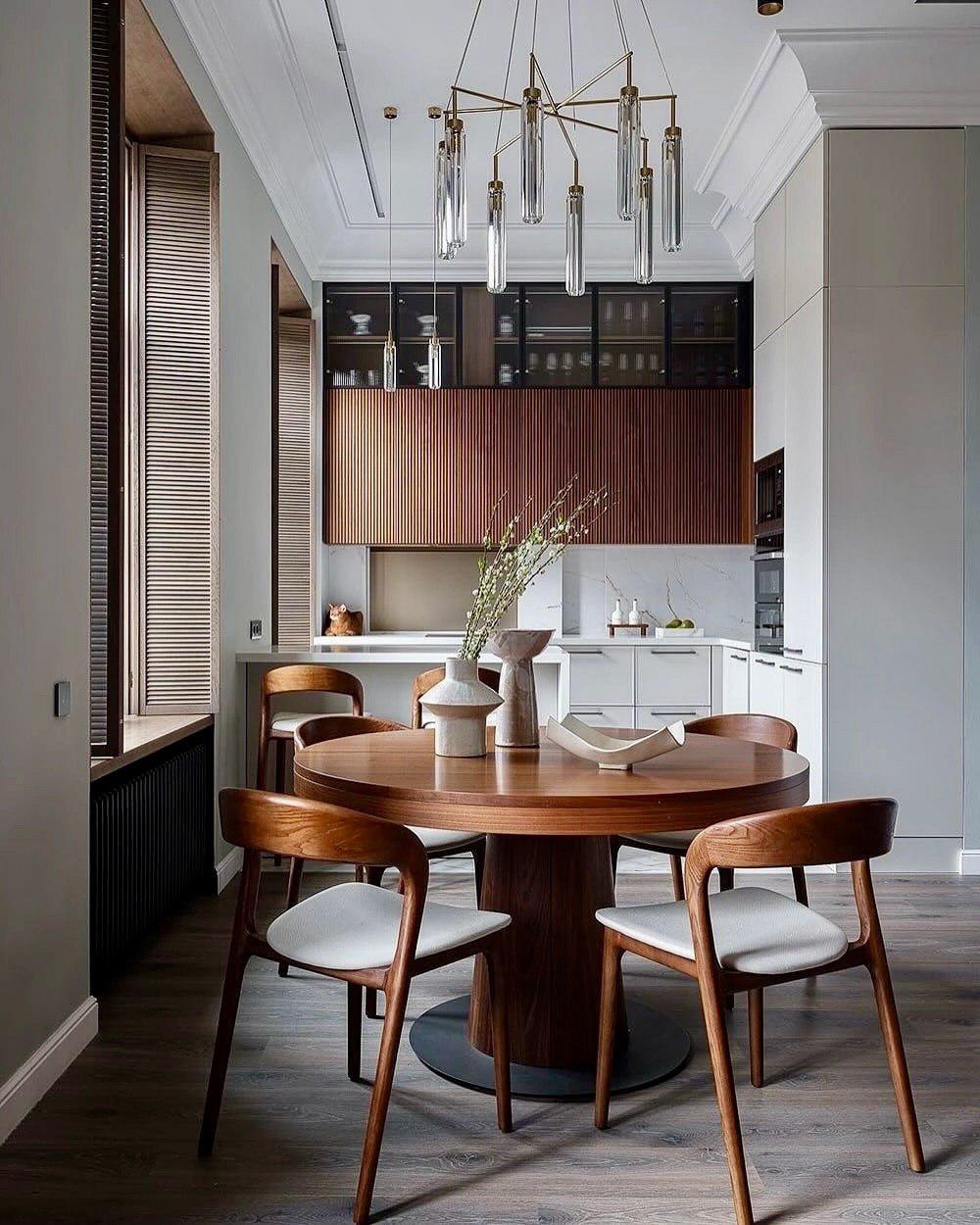 Обеденная зона становится центром притяжения круглой, камерной, располагающей к долгим разговорам. Лаконичная кухня не перетягивает на себя внимание, а мягко поддерживает общую композицию. Светильники добавляют ритм и подчёркивают вертикаль, делая интерьер более воздушным.