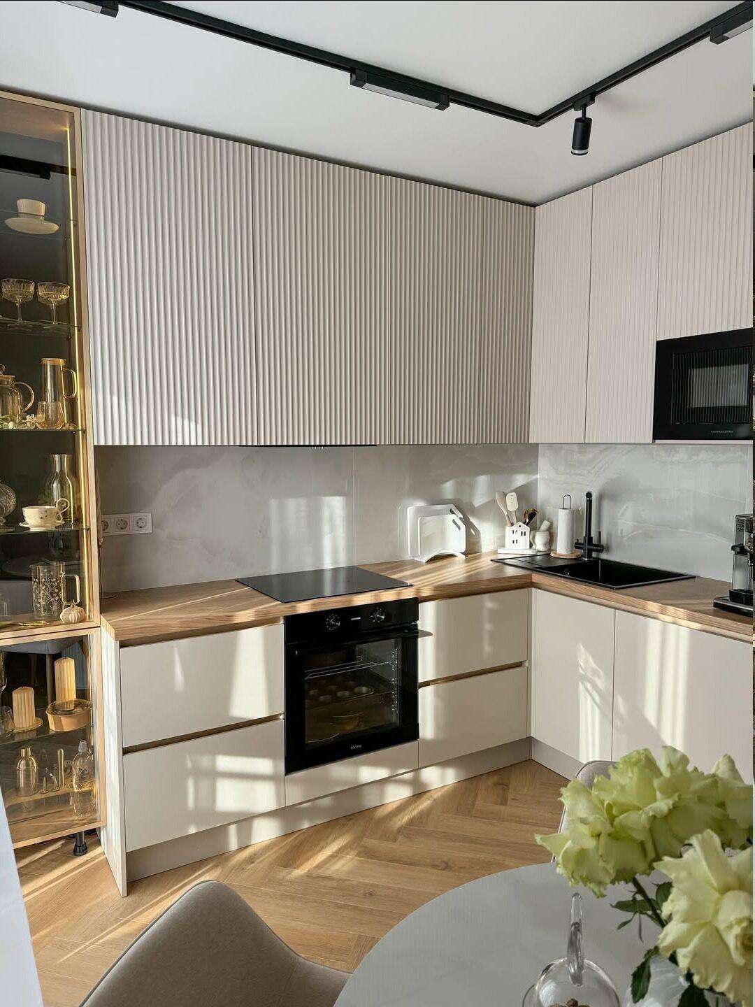 Ремонт кухни закончен. Пространство стало светлым и функциональным, где каждая деталь продумана для комфортного использования. Светлая мебель визуально увеличивает площадь, а деревянная столешница привносит в интерьер природные мотивы и добавляет уюта.