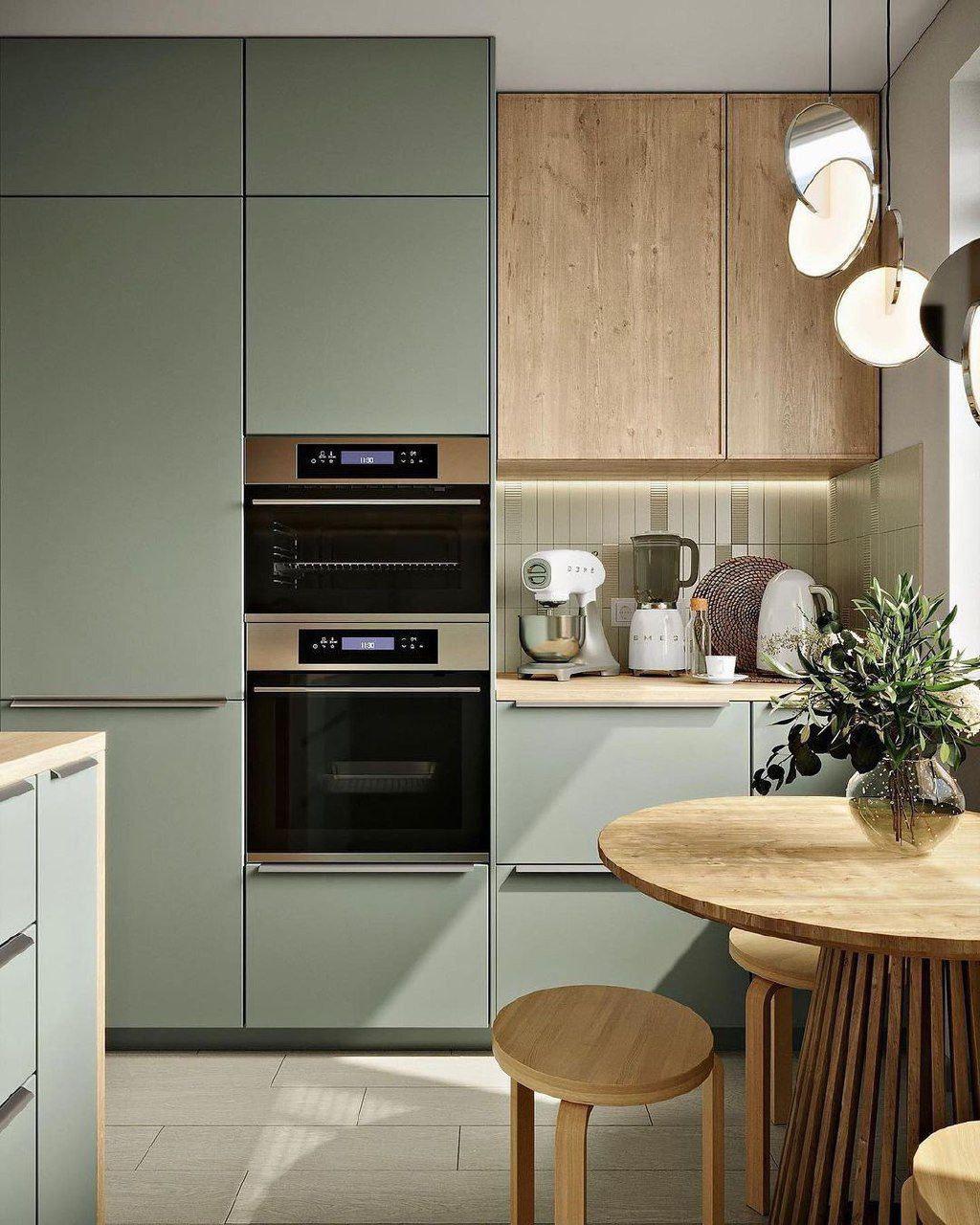 Натуральное дерево добавляет тепла и визуального баланса, делая интерьер живым и гармоничным. Благодаря сочетанию цвета и материалов кухня выглядит цельной, функциональной и не перегруженной, несмотря на скромный метраж.