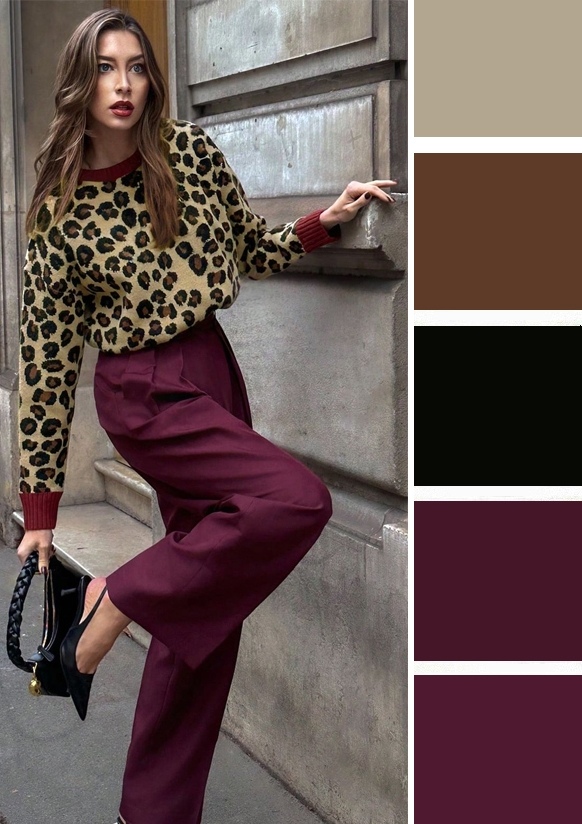 Леопардовый принт это грациозный рисунок, который делает образ более динамичным и прогрессивным. Сочетать его можно с бордовым, белым, другими оттенками коричневого, фиолетовым. А какой вариант нравится вам?