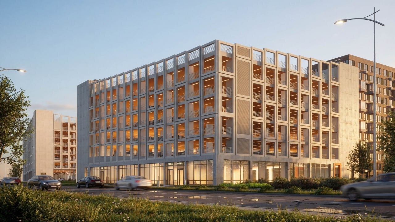 # Лучший проект Подмосковья ## Номинация: Объект промышленности и транспорта ### Гараж-стоянка на 300 машино-мест с объектами торговли **Местоположение:** Московская обл., Ленинский г.о., дер. Богданиха ### Архитектурное решение Архитектурный облик здания формируется за счет ритмичного расположения металлических кассет, горизонтальных ограждений и жалюзийных решеток. Данные элементы создают динамичную композицию. Строгость глухих лестничных объемов уравновешивает «воздушные» фасады, подчеркивая современный характер объекта и масштаб застройки. ### Планировочное решение Первый этаж паркинга многофункционален, он отведен под общественно-коммерческую функцию. Здесь размещаются торговые помещения и два поста шиномонтажа. Такое зонирование способствует удобству повседневного использования объекта жителями. **Авторский коллектив:** АСК «ЭСФОЭС АРХИТЕКТС» * Гарипов Ринат * Маннапов Ильяс * Копытов Александр * Вагизова Аделя * Фигура Анатолий