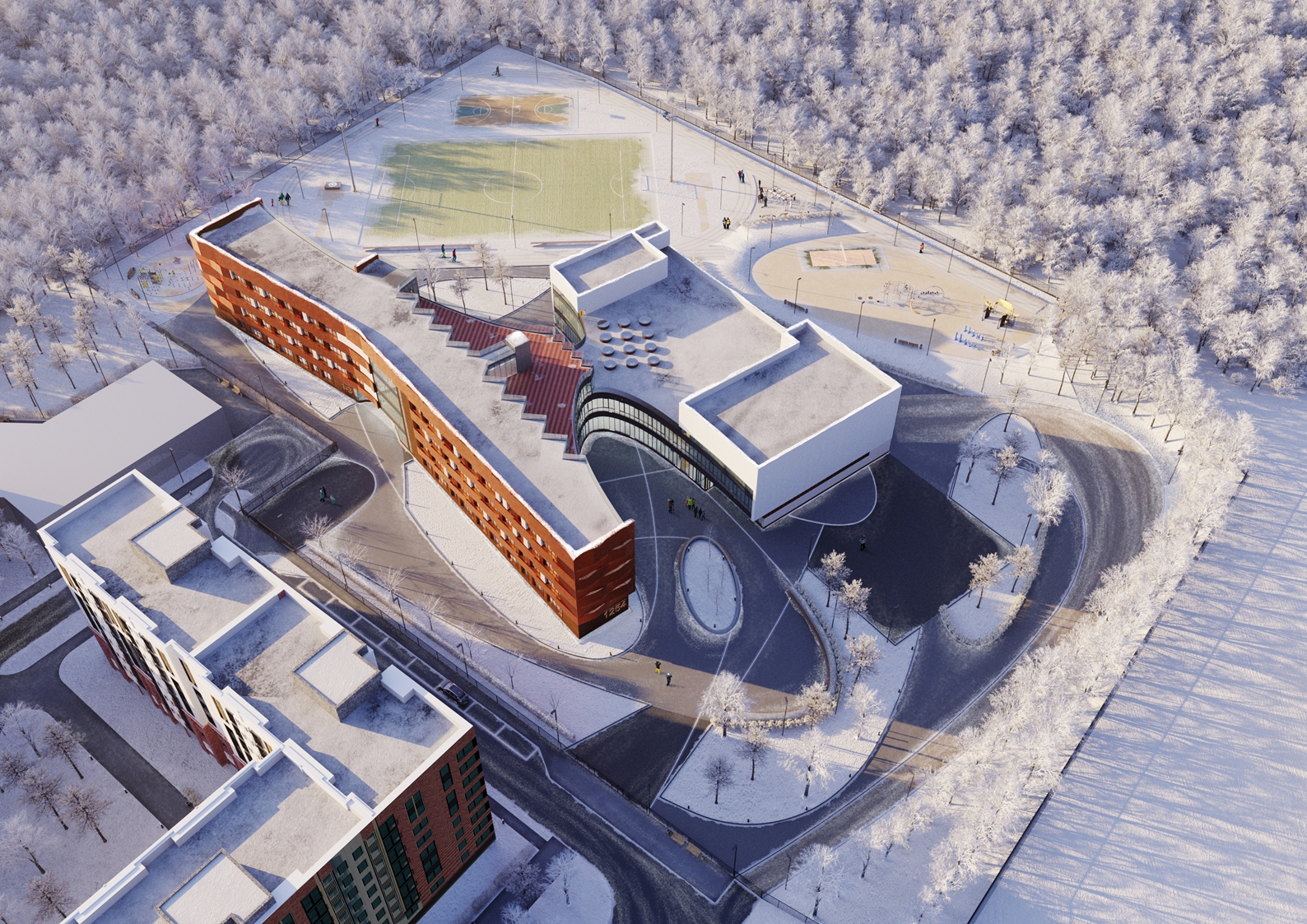 Школа имеет переменную этажность. Плоская кровля в уровне последнего этажа частично эксплуатируемая.