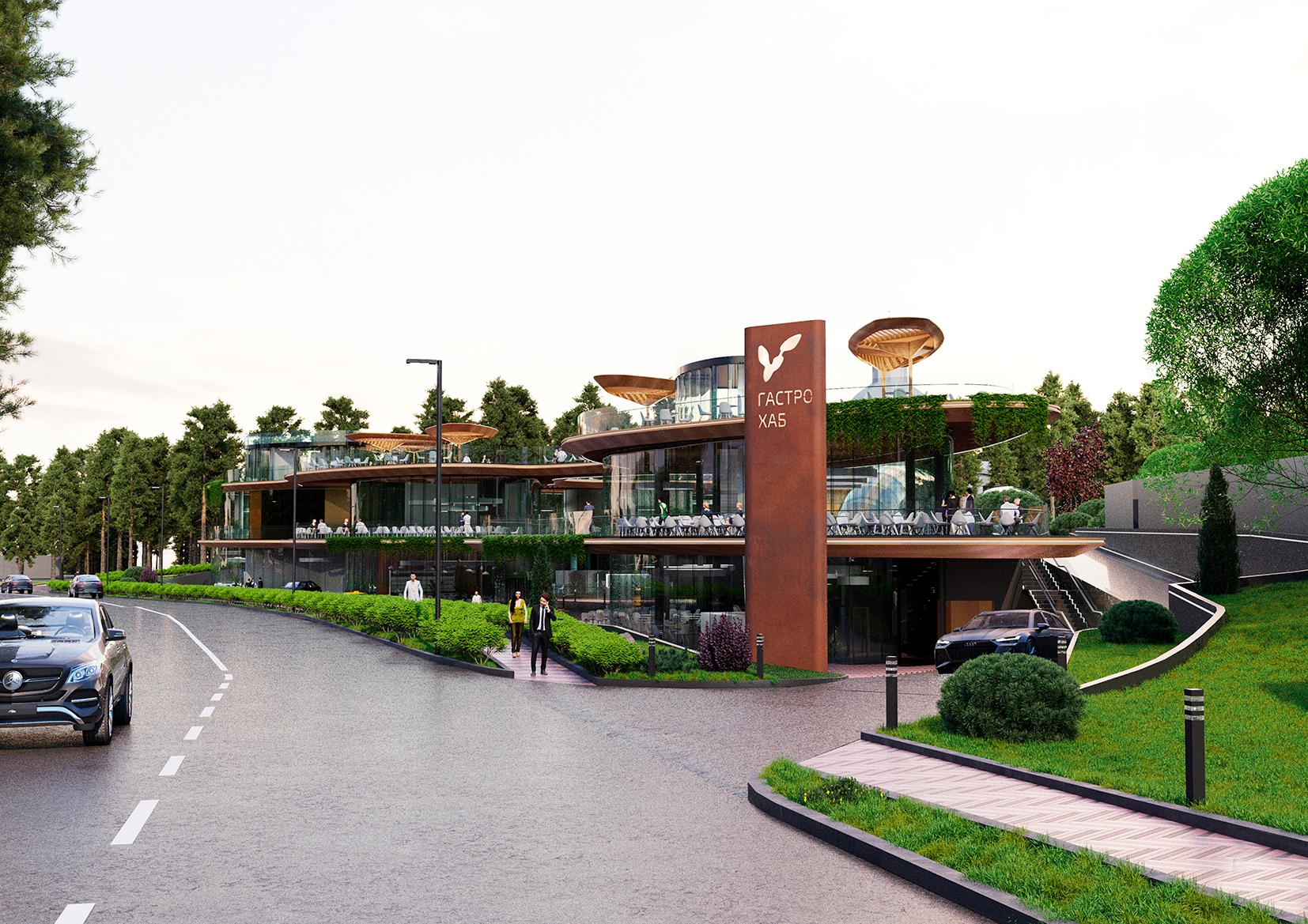 Обособленный гастрохаб создан для обеспечения досуга жителей близлежащих поселков. Объект включает в себя группу ресторанов, объединенных общей территорией и паркингом. Его островное расположение в малоэтажной застройке и акцент на экологичность создают приятную и спокойную атмосферу для посетителей.