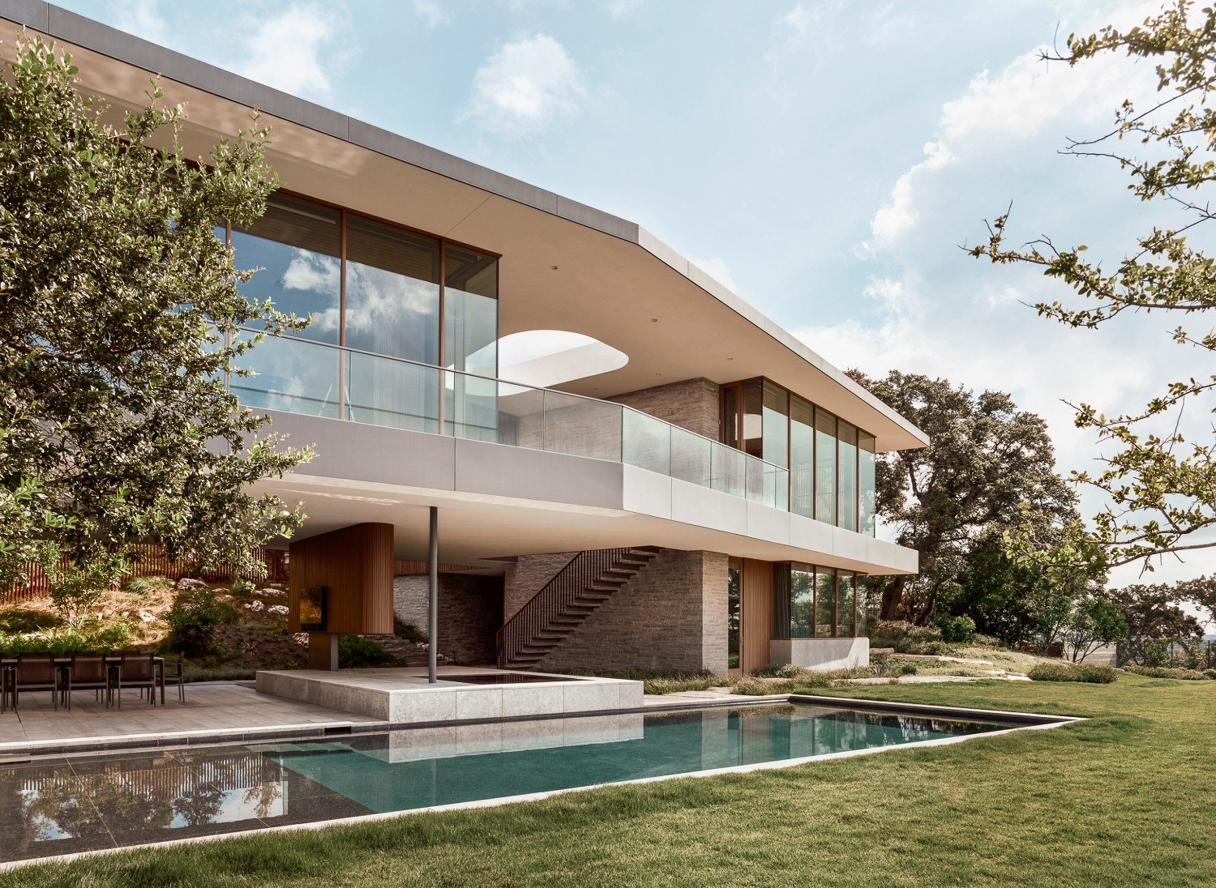 Дом площадью 650 квадратных метров возвышается над крутым склоном и выходит на холмы над знаменитым мостом Пеннибакер недалеко от Остина. Студия стремилась совместить уединение с захватывающими видами.
