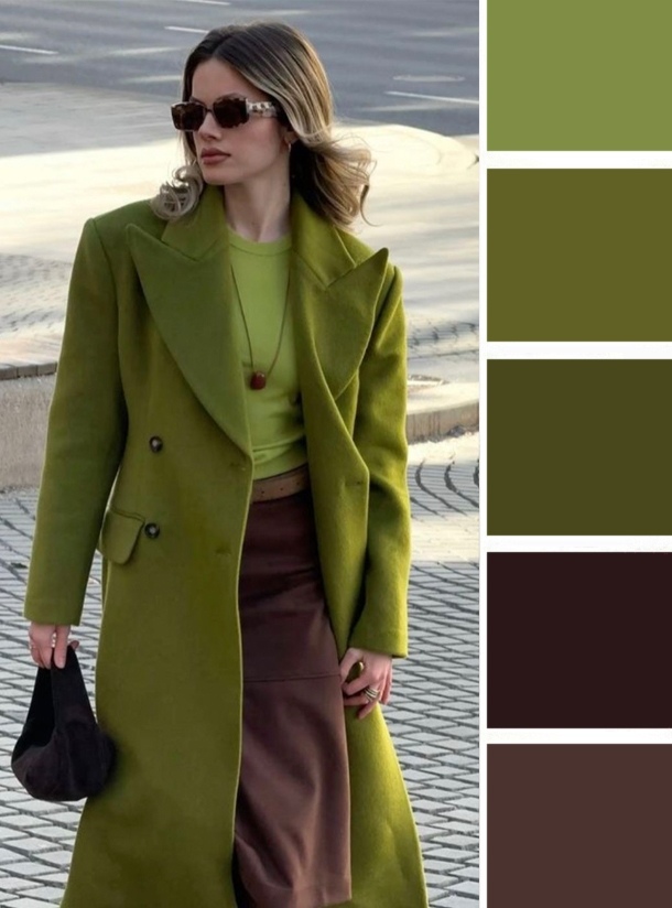 Мшисто-зелёные и коричневые тона это яркая и стильная композиция, которая выглядит насыщенно, но при этом не броско. Её можно дополнить светло-зелёным, золотым, бежевым, хаки и светло-серым.