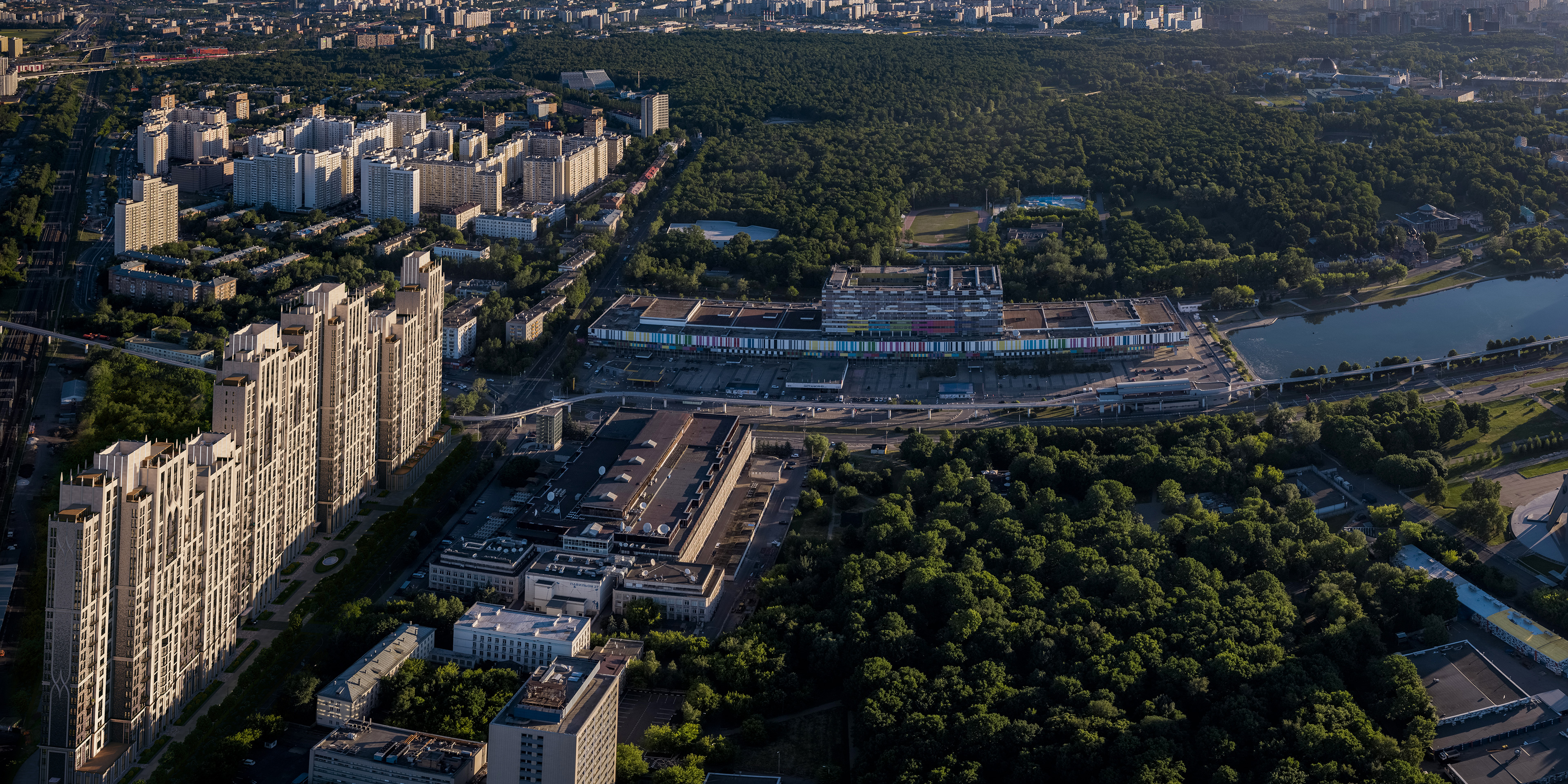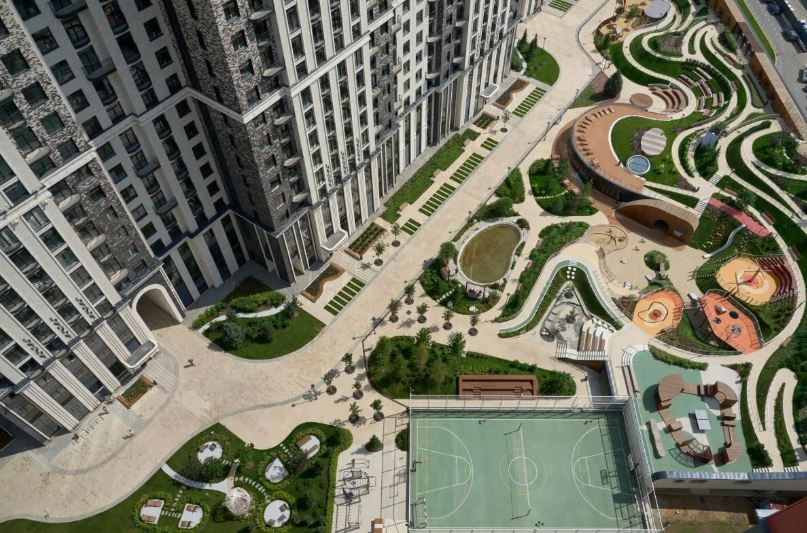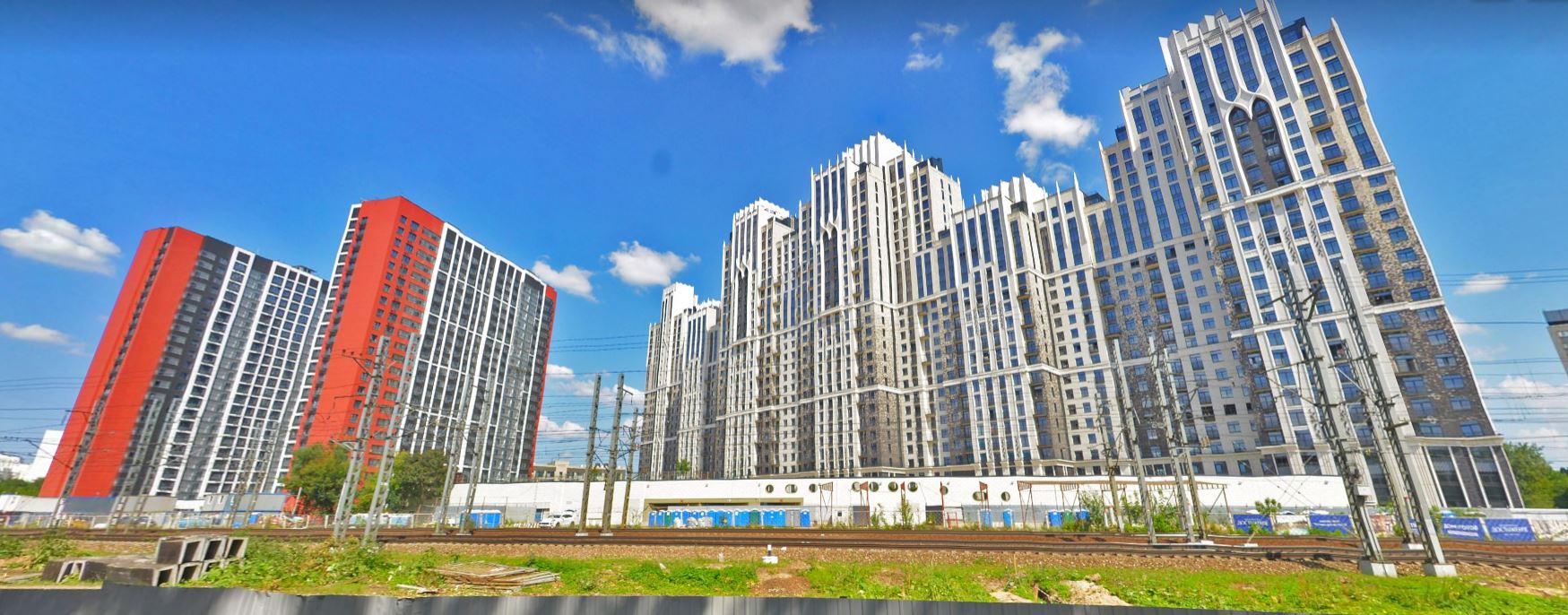 Размещение комплекса градостроительно неудачно. Здание расположено в непосредственной близости к железнодорожным путям и станции, что принципиально противоречит заявленному высокому классу жилья. Этажность 21–28 этажей избыточна для данного окружения — масштаб здания агрессивно доминирует над районом. Такой объём не должен был быть разрешён: снижение этажности минимум на 10–13 этажей было бы единственно корректным решением.