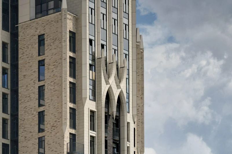 Фасады выполнены в эклектичной и перегруженной манере. Смешение плитки, цветовой растяжки от тёмного к светлому, элементов псевдоклассики и готических мотивов выглядит нелепо и не имеет концептуального обоснования. Балконы случайной формы, арки без функциональной или конструктивной логики, декоративные элементы «ради образа» создают ощущение архитектурного шума. Фасад однообразен по ритму и при этом визуально мельтешит, не формируя цельного образа. #Монтаж фасадов 2024год , #Ар-деко , #Ар-деко в архитектуре.