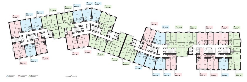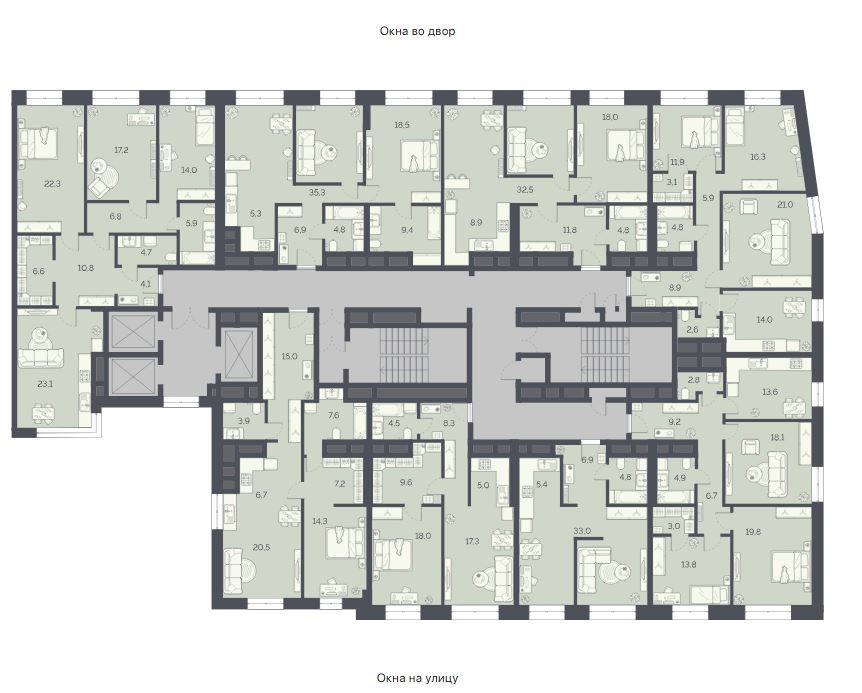 Планировочная структура построена по коридорному принципу: протяжённые внутридомовые коммуникации, высокая плотность квартир и минимальная дифференциация типологий. Такое решение ориентировано на оптимизацию продаваемой площади, а не на качество жилой среды и уровень приватности.