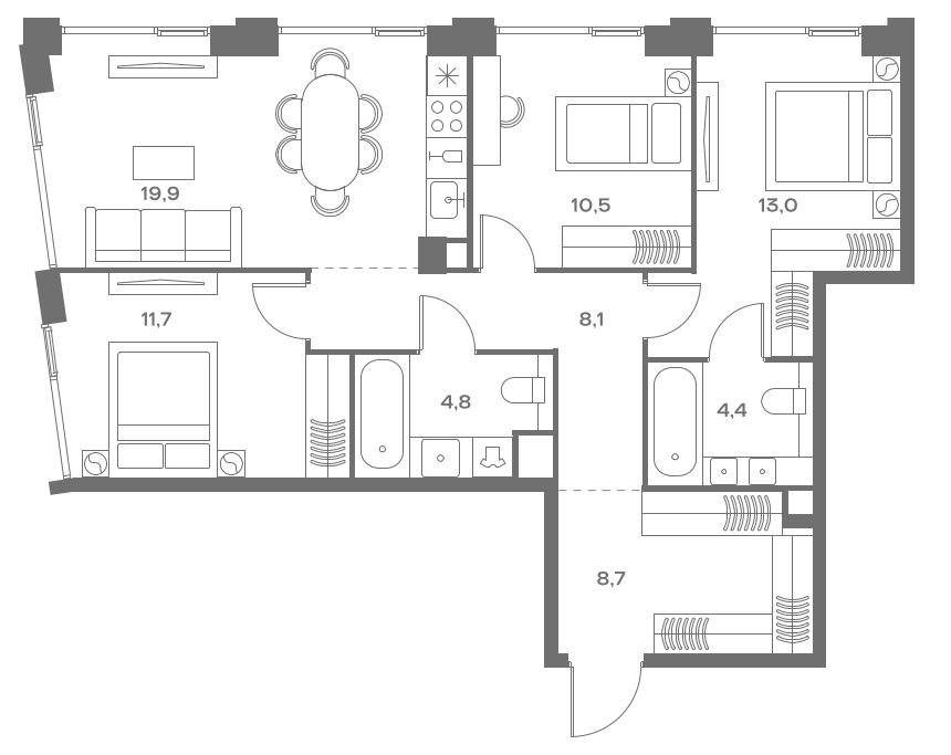 Композиционно проект построен на контрасте башен и малоэтажных корпусов, что добавляет вариативности, но не снимает проблему плотности. Планировки преимущественно простые и рациональные, без выраженной премиальности. Большое количество квартир на этаже снижает уровень приватности и усиливает ощущение «городского потока», что больше соответствует сегменту комфорт+/бизнес-массового формата.