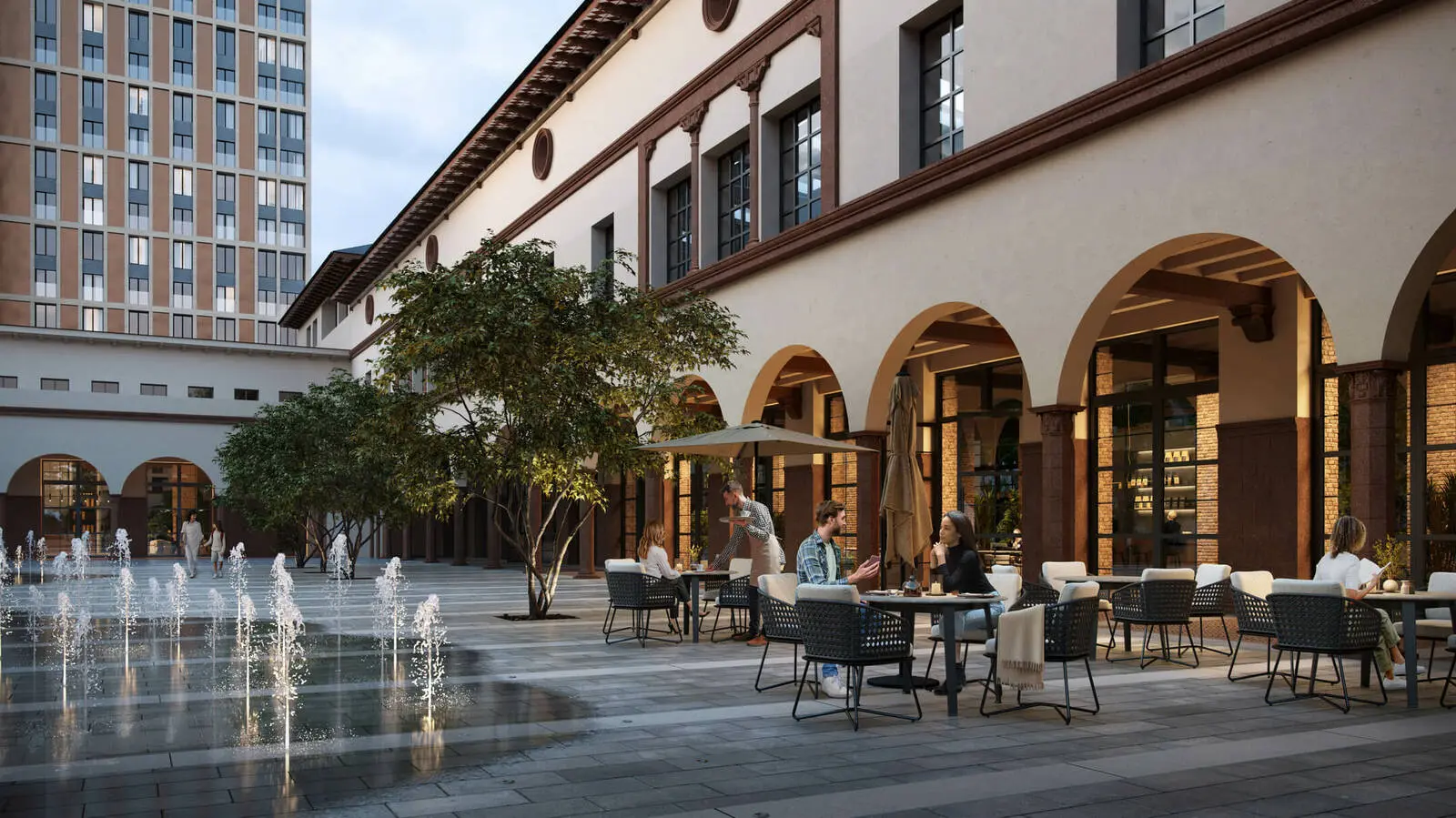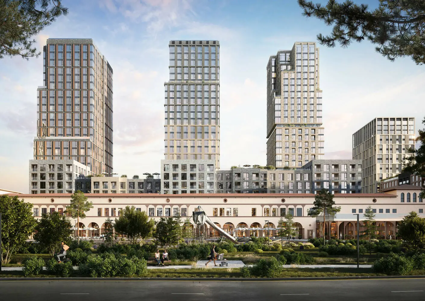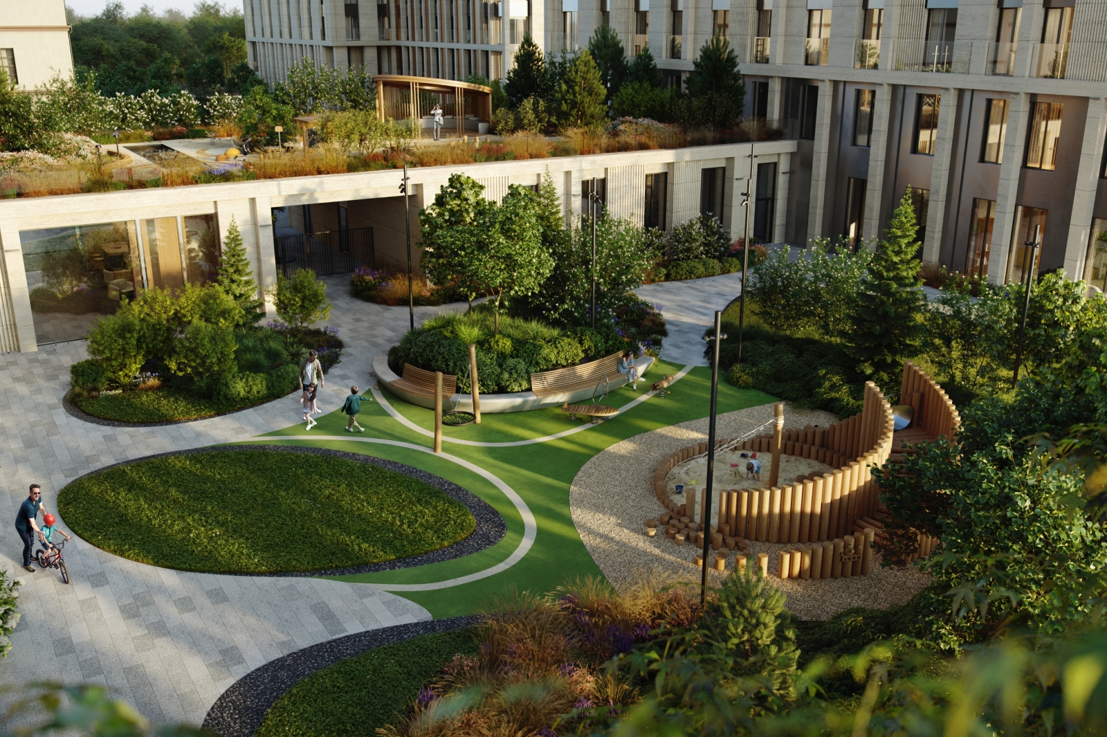 Общественные пространства выполнены качественно с точки зрения дизайна среды: видно, что концепция продумана, благоустройство аккуратное, заявлен культурный сценарий с реставрацией исторического здания. Однако при высокой плотности застройки нагрузка на дворы будет значительной, и для комфортных прогулок жителям, вероятно, придётся чаще пользоваться соседними крупными парками.