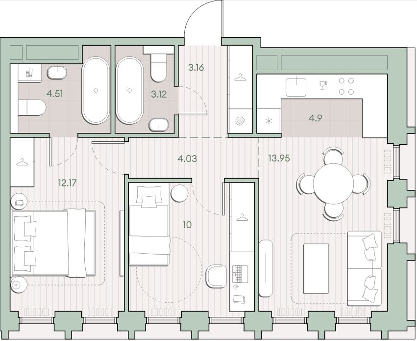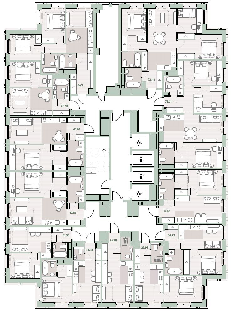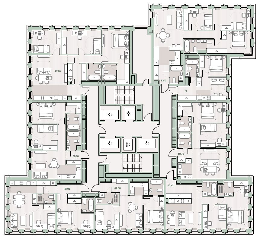 Объёмно-композиционное решение подчинено исключительно плотности. Планировки типовые, по своей сути эконом-класса: от 7 до 12 квартир на этаже, высокая нагрузка на лифтовые группы, минимальный уровень приватности. Несмотря на маркетинговые формулировки про «умные планировки», реальная логика проекта — массовая нарезка метров.