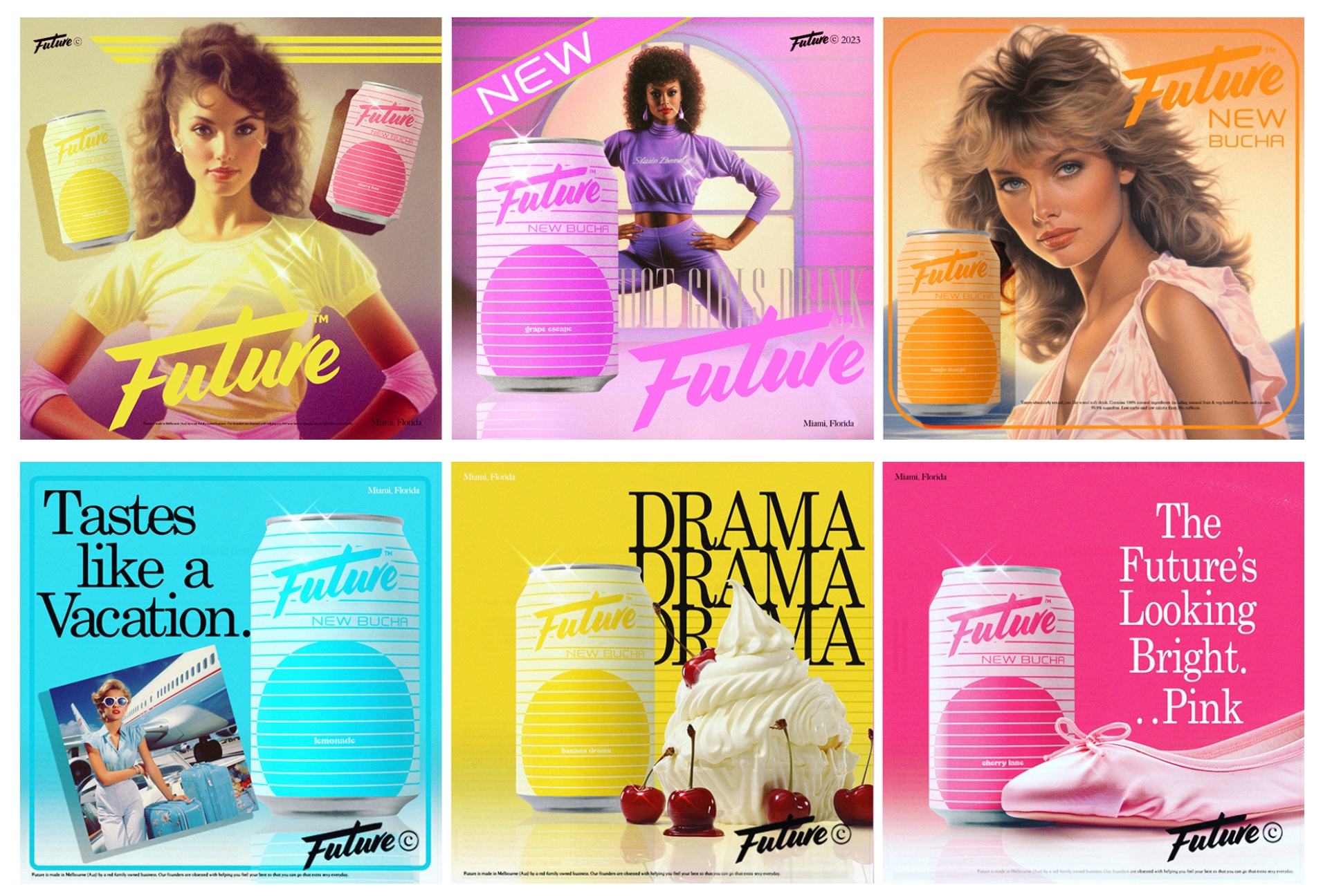 Ретро-эстетика в дизайне упаковки комбучи FUTURE от студии CandyBrophyCreative