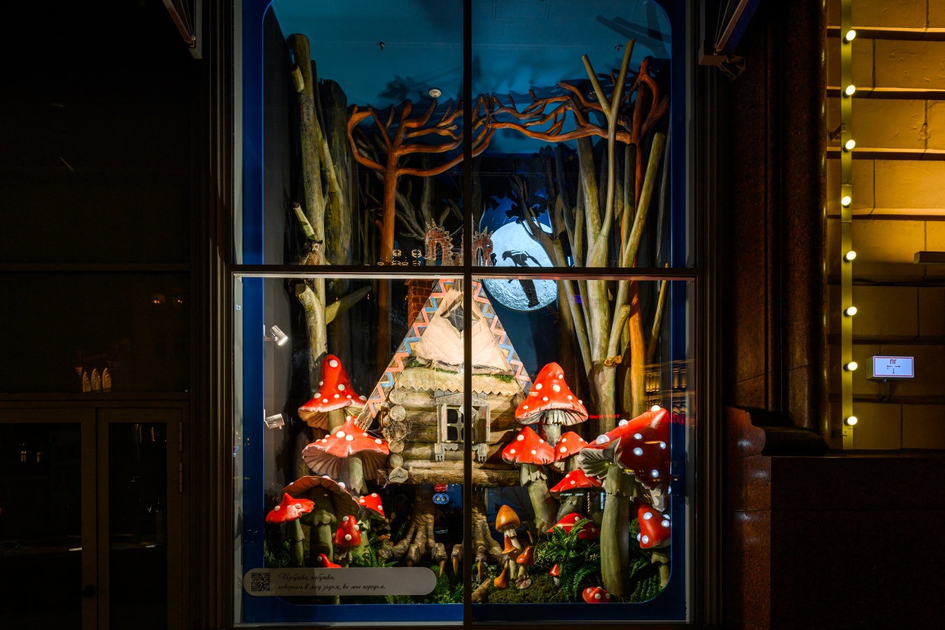 Вдоль фасада здания представлены сюжеты из «Красной Шапочки», «Руслана и Людмилы» и других сказок.