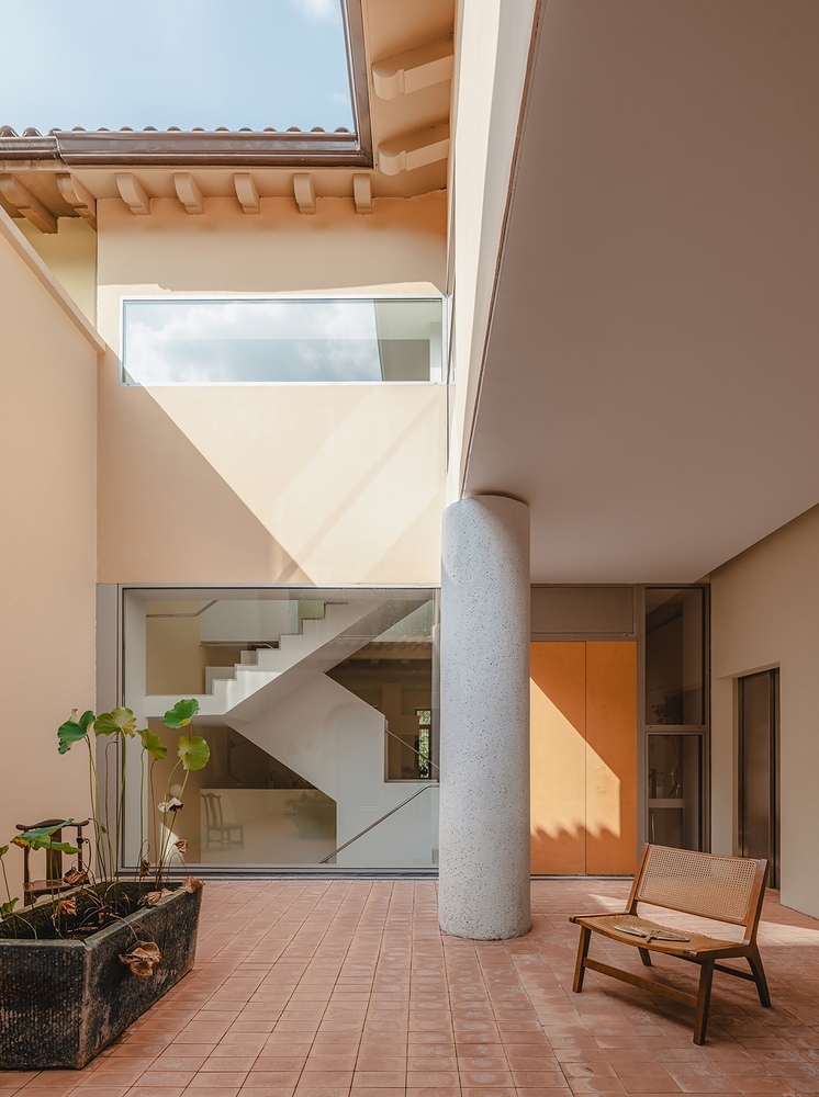 Первый акт организации: следуя по пути жизни Существующее трехэтажное здание расположено на террасированном участке, до которого можно добраться как с севера, так и с юга. Многолетняя привычка сформировала вертикальное функциональное зонирование: второй этаж, соединенный с автомобильной дорогой в южной части сообщества, служил главным входом и включал в себя гостиную, гараж, гостевую комнату, балкон и атриум; первый этаж, примыкающий к подпорной стене холма и выходящий на задний сад, был соединен со вторым входом для пешеходов и состоял из столовой, кухни и комнаты для развлечений; третий этаж был самой уединенной спальной зоной, в которой находились две спальни и кабинет. После непрерывных обсуждений и сравнений различных схем, это зонирование было сохранено при реконструкции. Основное внимание было уделено тому, как раскрыть пространственный потенциал дома, чтобы он стал катализатором эволюции будущей жизни.