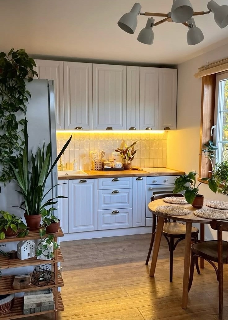 Светлая кухня с белыми фасадами, тёплым деревом и обилием зелени, мягкая подсветка и натуральные материалы создают атмосферу спокойствия и тепла.