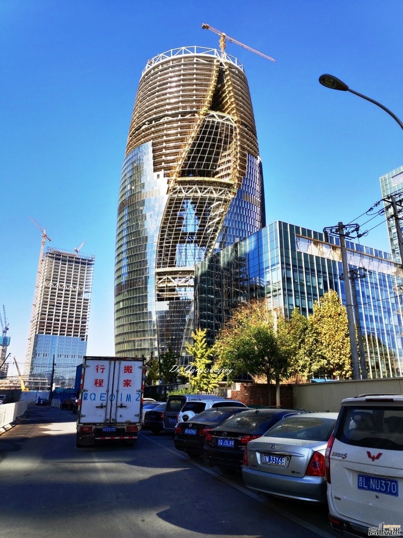 В сети появились новые фотографии строящейся многофункциональной офисной башни Leeza Soho в финансовом районе Пекина. Главная особенность сооружения, спроектированного бюро Zaha Hadid, — самый высокий в мире, 190-метровый атриум, объединяющий две отдельные криволинейные башни в единый объем. Общая высота здания — 207 метров.