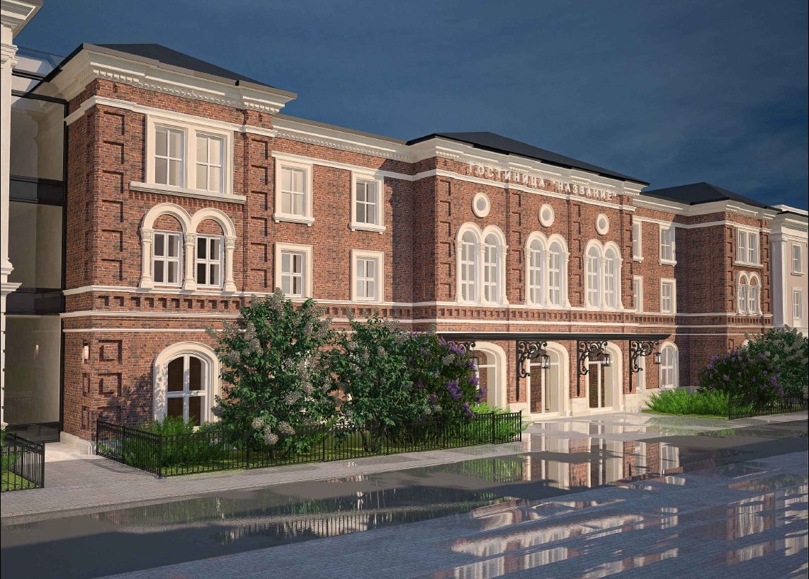 Трехэтажный гостиничный комплекс визуально разделен на три разностилевых объема, каждый из которых имитирует отдельно стоящую постройку. Это решение продиктовано градостроительным регламентом (ограничение по высоте 12 метров и длине фасада 12 метров).