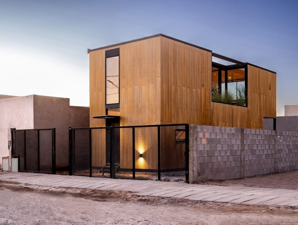 «Веганский дом» был спроектирован для одинокой женщины, которая работает в нефтяной промышленности в Вака-Муэрта, недалеко от города Неукен. Сочетая засушливый ландшафт и тепло дерева, дом становится воплощением автономности и заботы: небольшой архитектурный проект, воспевающий жизнь, современный образ жизни и повседневное благополучие с точки зрения экологически и экономически надёжного и безопасного строительства.