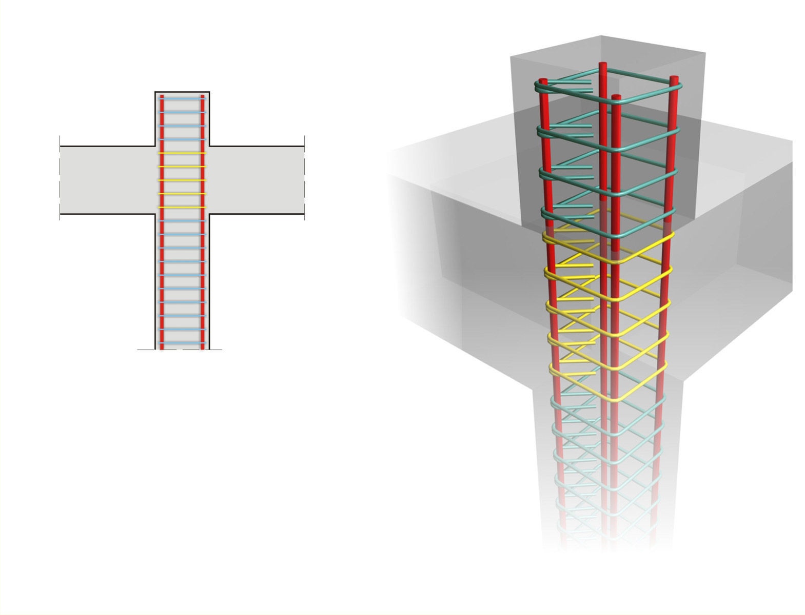 ## Методы фиксации арматуры верхнего уровня пола Корректное закрепление арматуры колонн на уровне верхнего перекрытия обеспечивает их надлежащее функционирование в конструкции. Существует несколько эффективных способов реализации этого элемента. ### Альтернативные решения для закрепления арматуры Наиболее конструктивно простым и эффективным методом является устройство «бетонной шляпы» в верхней части колонны. Такое решение позволяет крепить арматурные стержни без необходимости их изгиба, что упрощает процесс монтажа и гарантирует надежность соединения, как показано на изображении.